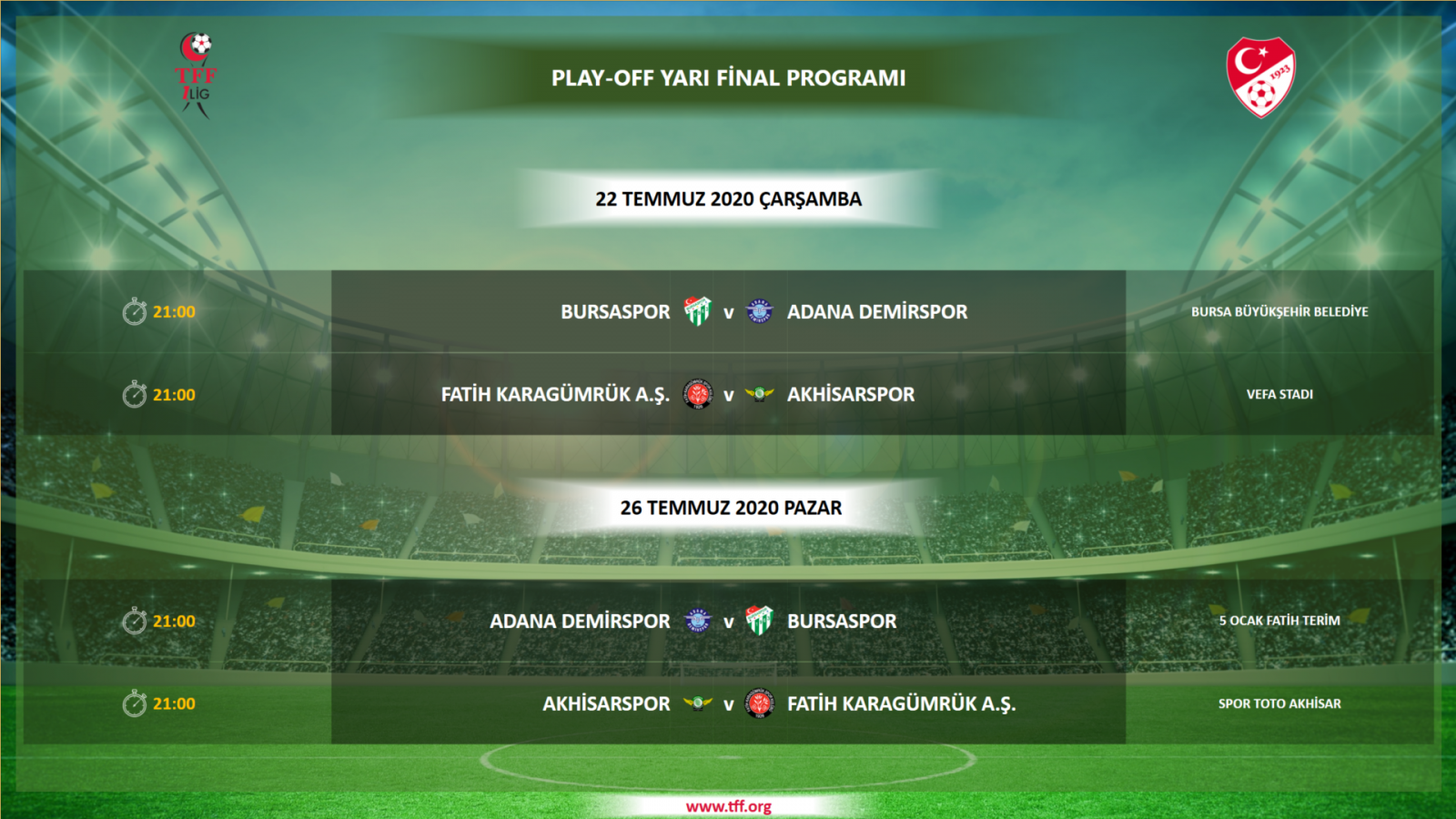 Play-off yarı serisinde Adana Demirspor ile Bursaspor, Akhisarspor ile Fatih Karagümrük eşleşti. Bu serileri geçen takımlar play-off finalinde Süper Lig'e çıkmak için mücadele edecek. Yarı final serileri çift maçlı eleminasyon sistemi ile final maçı ise tek maç üzerinden oynanacak