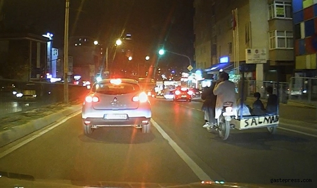Kazaya davetiye çıkaran motosiklet sürücüsü, trafikteki diğer araç sürücülerinin canını da hiçe saydı. İki kişi motosiklet üzerinde kasksız bir şekilde seyahat ederken, üç çocuk ise motosiklet sepetinde düşme tehlikesi ile yoluna devam etti.