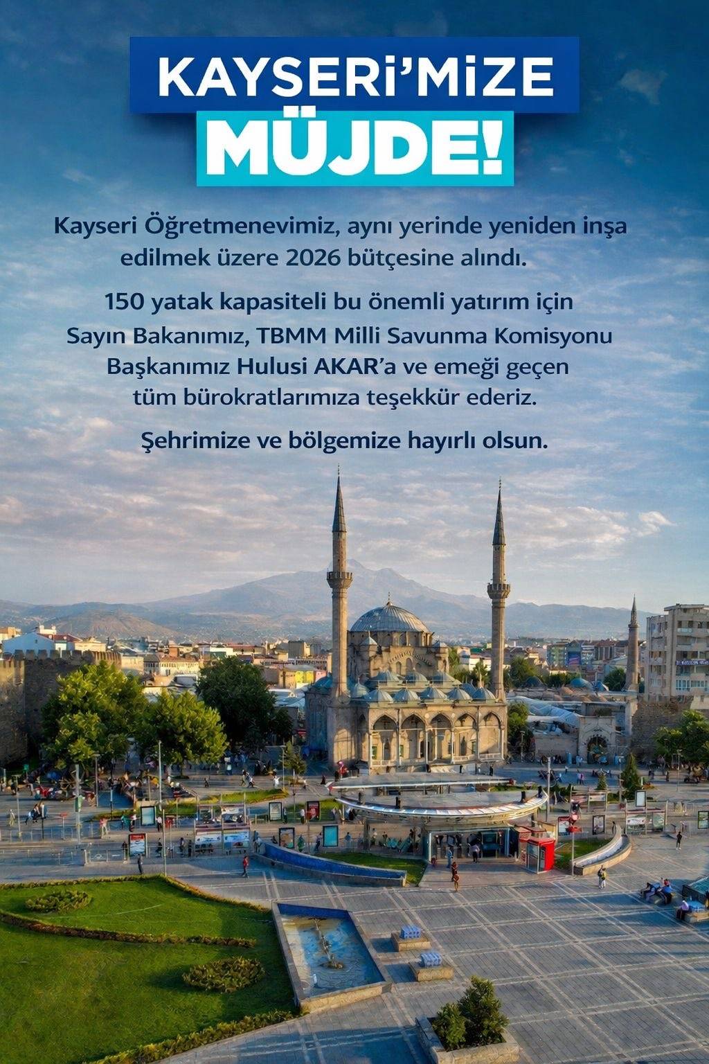 Sosyal medya hesabından paylaşım yapan Böhürler, öğretmenevinin mevcut yerinde yeniden yapılacağını ve 150 yatak kapasiteli olacağını belirtti. Böhürler açıklamasında, “Kayseri öğretmenevimiz, aynı yerinde yeniden inşa edilmek üzere 2026 bütçesine alındı. 150 yatak kapasiteli bu önemli yatırım için Sayın Bakanımız, TBMM Milli Savunma Komisyonu Başkanımız Hulusi Akar’a ve emeği geçen tüm bürokratlarımıza teşekkür ederiz. Şehrimize ve bölgemize hayırlı olsun” ifadelerini kullandı.