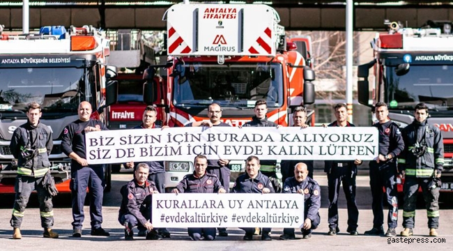 Antalya Büyükşehir Belediyesi İtfaiyesi ayrıca “Evde Kal” çağrısına da pankartlarıyla destek istedi. Salgına rağmen 7 gün 24 saat görev başına olan İtfaiye personeli herkesin kurallara uymasını isteyerek “Biz sizin için burada kalıyoruz. Siz de bizim için evde kalın lütfen” mesajı verdi. İtfaiye personeli bu çağrıyı Türkçe, Rusça ve İngilizce olarak yaptı.
