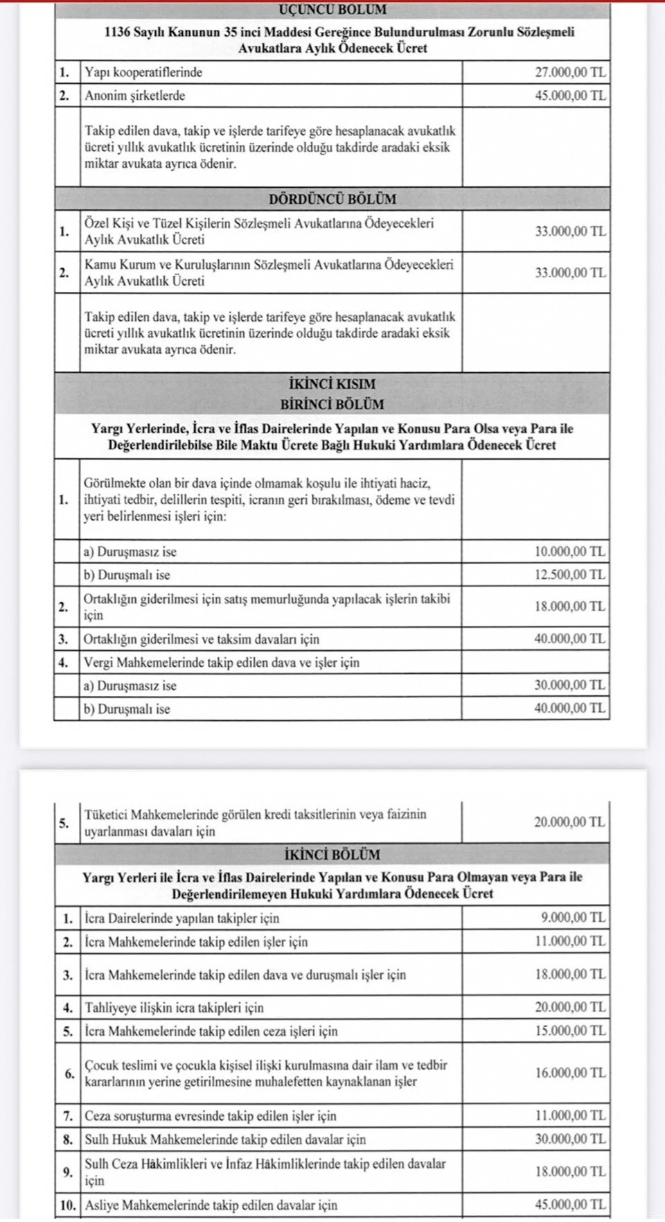 Türkiye Barolar Birliği Başkanlığı, yeniden belirlenen "Avukatlık Asgari Ücret Tarifesini" dün akşam duyurdu.