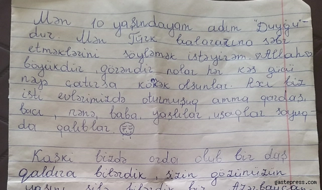 6 Şubat'ta Kahramanmaraş merkezli 11 ili etkileyen 7.7 ve 7.6 büyüklüğündeki depremlerin ardından afet bölgelerine yardımlar yurt içi ve yurt dışından devam ediyor. Ülke geneli ve birçok ülkelerden depremzedeler için yardım malzemeleri gelirken, Elbistan ilçesine Azerbaycan'dan gelen yardım kolilerinden çıkan mektup ise görevlileri duygulandırdı. 10 yaşındaki Duygu'nun yazdığı duygu dolu mektupta, "Ben 10 yaşındayım. İsmim Duygu. Ben Türk çocuklarına sabretmelerini söylemek istiyorum. Allah büyüktür, herkesin neye gücü yetiyorsa yardım etsinler. Biz sıcak evlerimizde otururken, kardeşlerimiz ve ablalarımız, büyüklerimiz, yaşlılar, çocuklar soğukta kalmışlar. Keşke biz de orada olabilseydik. Bir taş kaldırabilirdik. Sizin gözünüzün yaşını silebilirdik. Biz Azerbaycan halkı her zaman sizin yanınızdayız. Sabredin, Türk kardeşlerimiz ve bacılarımız" ifadeleri yer aldı.