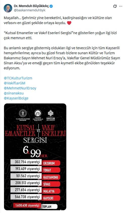 Başkan Büyükkılıç, sosyal medya hesabından yaptığı paylaşımda Kayseri’nin kültüre olan bağlılığını bir kez daha ortaya koyduğunu vurgulayarak, “Maşallah… Şehrimiz yine bereketini, kadirşinaslığını ve kültüre olan vefasını en güzel şekilde ortaya koydu. ‘Kutsal Emanetler ve Vakıf Eserleri Sergisi’ne gösterilen yoğun ilgi bizi çok memnun etti” ifadelerini kullandı.