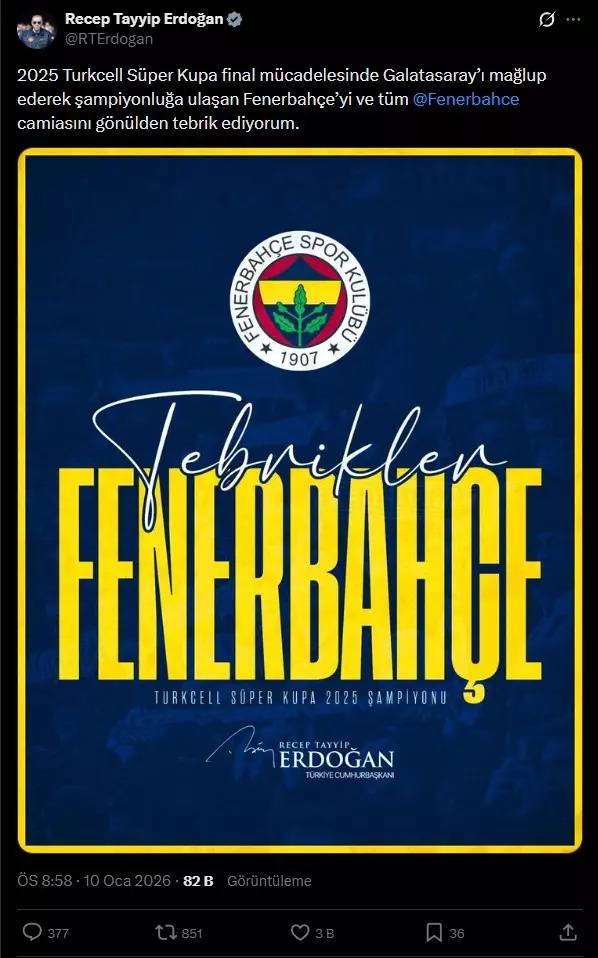 Cumhurbaşkanı Erdoğan, sosyal medya hesabından yaptığı paylaşımda, “2025 Turkcell Süper Kupa final mücadelesinde Galatasaray’ı mağlup ederek şampiyonluğa ulaşan Fenerbahçe’yi ve tüm Fenerbahçe camiasını gönülden tebrik ediyorum.” ifadelerine yer verdi.