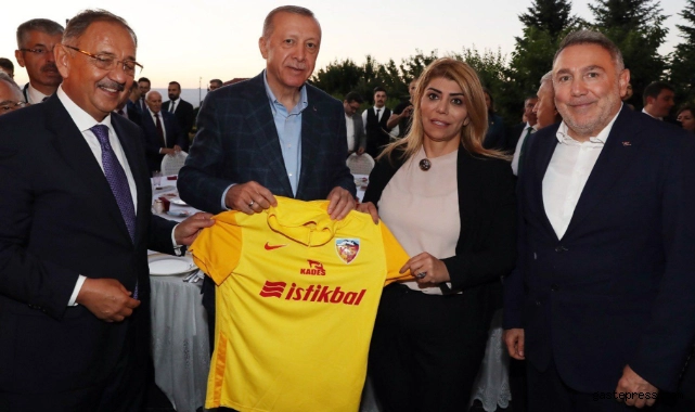 Yukatel Kayserispor Başkanı Berna Gözbaşı, Cumhurbaşkanı Recep Tayyip Erdoğan'a sarı kırmızılı kulübün yeni formasını hediye etti.