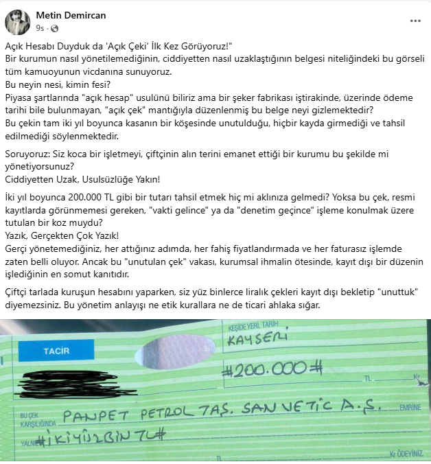 Demircan paylaşımında, “Açık hesabı duyduk da ‘açık çeki’ ilk kez görüyoruz” ifadelerini kullanarak, söz konusu belgenin bir kurumun nasıl yönetilemediğinin açık bir göstergesi olduğunu savundu. Paylaşılan belgenin kamuoyunun vicdanına sunulması gerektiğini belirten Demircan, Kayseri Şeker’deki yönetim anlayışını sert sözlerle eleştirdi.