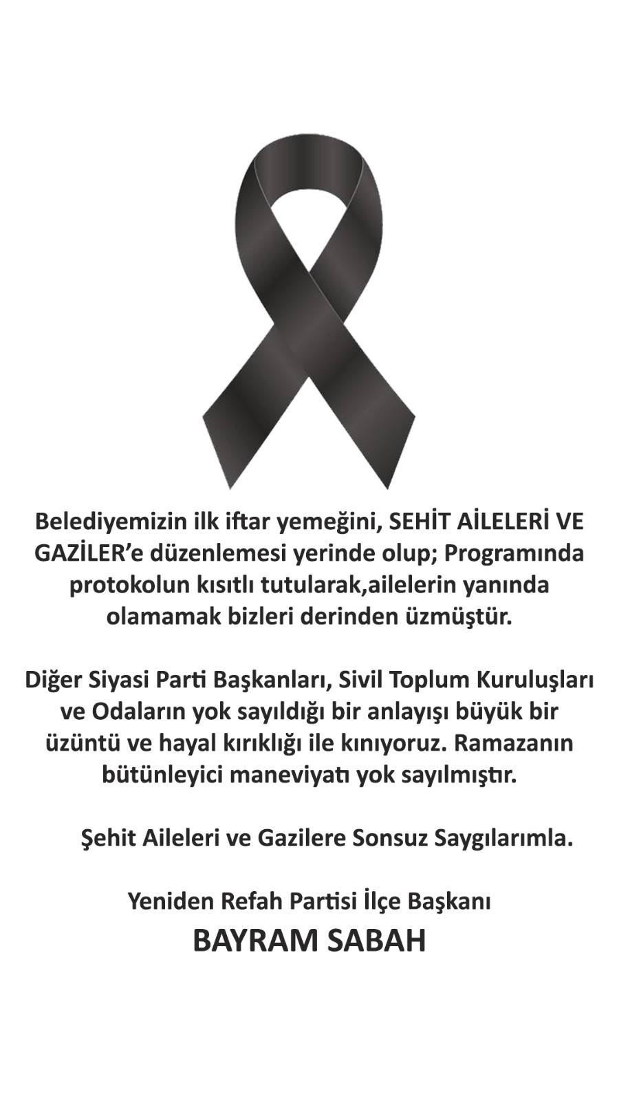 Yeniden Refah Partisi Develi İlçe Başkanı Bayram Sabah, belediyenin ilk iftar programını şehit aileleri ve gazilere yönelik düzenlemesini yerinde bulduklarını belirterek, protokolün kısıtlı tutulmasını eleştirdi. Sabah, diğer siyasi parti başkanları, sivil toplum kuruluşları ve odaların davet edilmemesinin üzücü olduğunu ifade ederek, Ramazan ayının birleştirici ruhunun göz ardı edildiğini savundu.