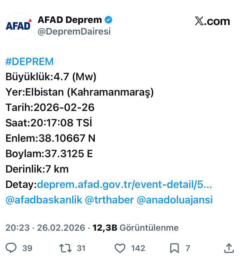 Enlemi 38.10667 N, boylamı ise 37.3125 E olarak açıklanan deprem, başta Kahramanmaraş olmak üzere çevre ilçelerde de hissedildi. Sarsıntı, komşu il Kayseri’de de vatandaşlar tarafından kısa süreli paniğe neden oldu.