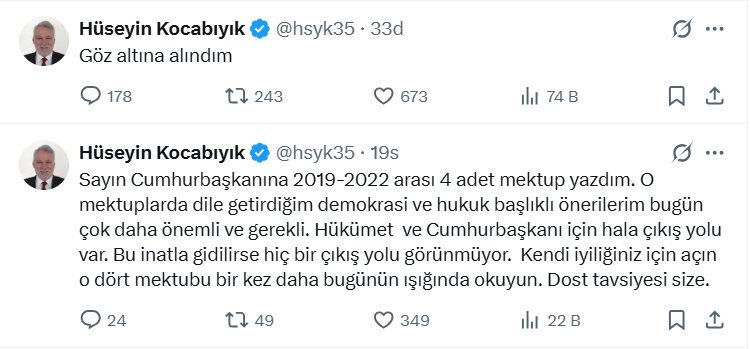 Eski AK Parti İzmir Milletvekili Hüseyin Kocabıyık, sosyal medya hesabından yaptığı açıklamada, "gözaltına alındım" ifadesini kullandı.