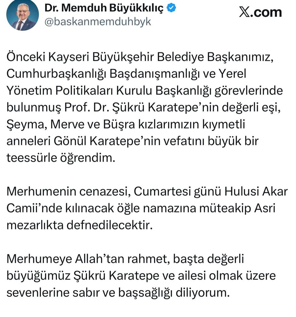 Büyükkılıç paylaşımında, “Önceki Kayseri Büyükşehir Belediye Başkanımız, Cumhurbaşkanlığı Başdanışmanlığı ve Yerel Yönetim Politikaları Kurulu Başkanlığı görevlerinde bulunmuş Prof. Dr. Şükrü Karatepe’nin değerli eşi, Şeyma, Merve ve Büşra kızlarımızın kıymetli anneleri Gönül Karatepe’nin vefatını büyük bir teessürle öğrendim. Merhumenin cenazesi, Cumartesi günü Hulusi Akar Camii’nde kılınacak öğle namazına müteakip Asri Mezarlık’ta defnedilecektir. Merhumeye Allah’tan rahmet, başta değerli büyüğümüz Şükrü Karatepe ve ailesi olmak üzere sevenlerine sabır ve başsağlığı diliyorum” ifadelerine yer verdi.