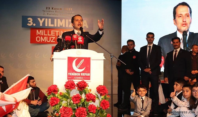 "Necmettin Erbakan, 2011'de son nefesini verene kadar istikametten sapmadan bu hak dava uğrunda mücadele etti. Bizler de merhum Erbakan hocamızdan almış olduğumuz o şuurla aynı hak dava uğrunda milli görüş sancağını taşımak üzere açılarından saptırmadan, istikametinden ayırmadan o şanlı sancağı taşımak üzere 3 sene evvel 23 Kasım 2018'de 99 kurucumuzun imzasıyla Yeniden Refah Partimizi resmen kurduk ve Türk siyasi hayatına kazandırdık. Elbette ki Yeniden Refah Partimizi kurarken karşılaşacağımız zorlukları çok iyi biliyorduk. Bu yolun çok uzun, meşakkatli ve çileli bir yol olduğunu çok iyi biliyorduk. Yeniden Refah Partimizi kurarken ikinci 40 yıl hareketini başlatırken merhum liderimizin 'Eğer biz inanır ve çalışırsak Allah bize yardım eder. Allah bize yardım ederse kimse bize galip gelemez' sözüne kulak vererek yola çıktık." Şeklinde konuştu.