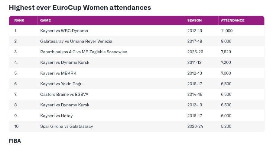 Açıklanan “en çok seyirciyle oynanan ilk 10 maç” listesinde Kayseri Kadın Basketbol Takımı adeta tarihe damga vurdu. Listenin 1. sırasında, 2012-2013 sezonunda oynanan Kayseri – WBC Dynamo karşılaşması yer aldı. Bu mücadele, 11.000 seyirciyle EuroCup Women tarihinin en kalabalık maçı olarak kayıtlara geçti.