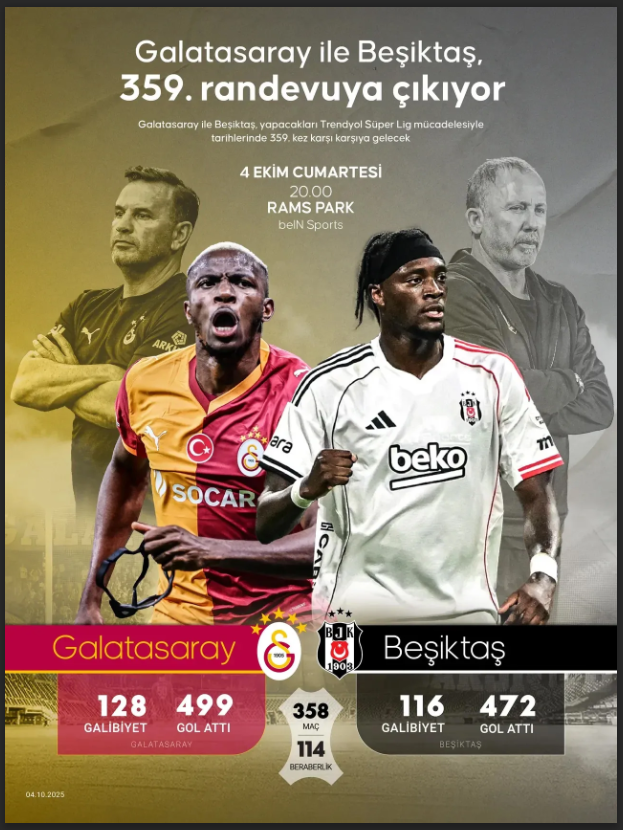 Trendyol Süper Lig'in 8. haftasında ezeli rakipler Galatasaray ve Beşiktaş karşı karşıya geliyor. RAMS Park'ta saat 20.00'de başlayacak karşılaşmayı, hakem Yasin Kol yönetecek.