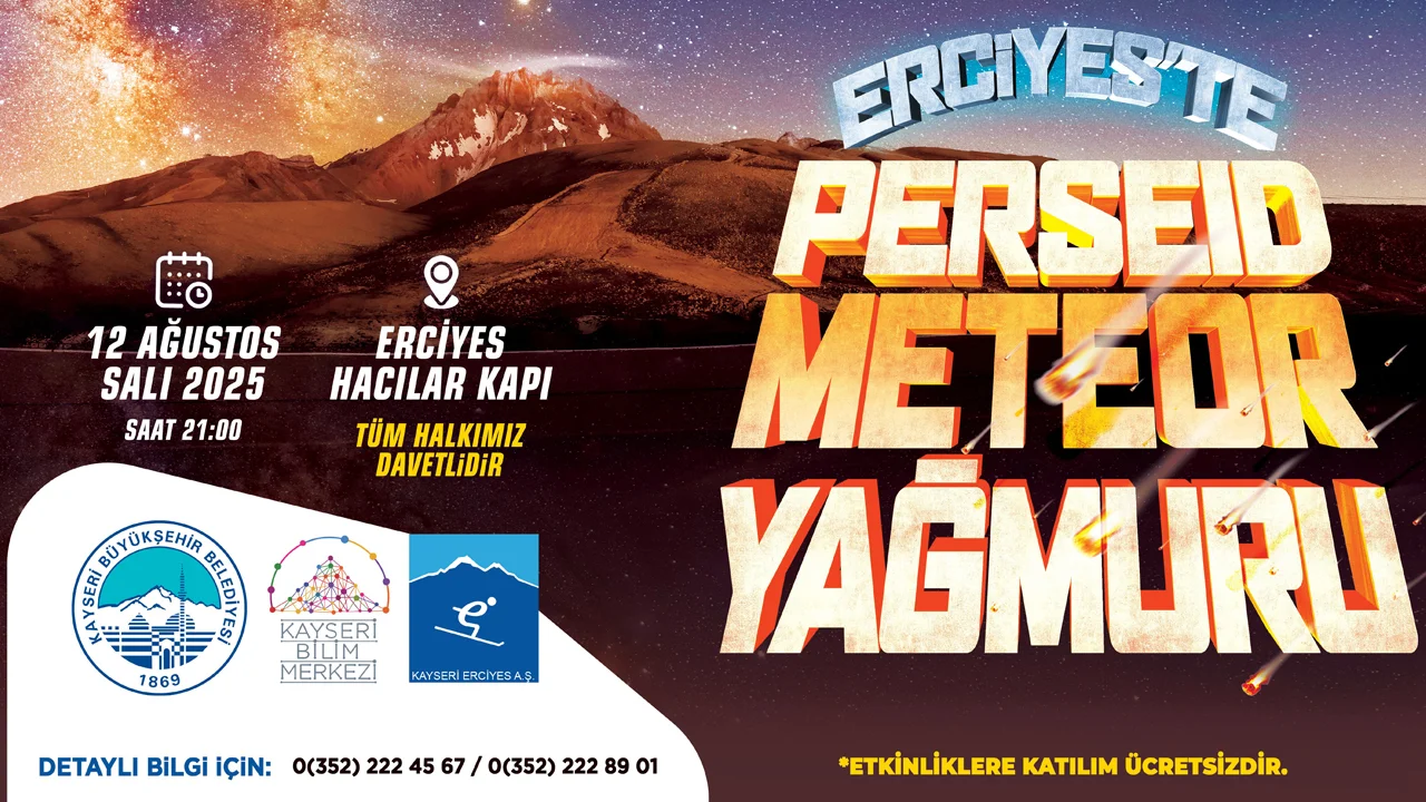 Çeşitli kültür sanat ve eğlence etkinlikleri ile Kayserilileri buluşturan Başkan Dr. Memduh Büyükkılıç yönetimindeki Büyükşehir Belediyesi, Erciyes’te düzenlediği yaz etkinlikleri çerçevesinde her yıl gökyüzü meraklılarından yoğun ilgi gören Perseid Meteor Yağmuru gözlem şöleni etkinliği ile bu yıl da gökyüzü tutkunlarına unutulmaz bir deneyim yaşatmaya hazırlanıyor. Büyükşehir Belediyesi Erciyes A.Ş. ve Kayseri Bilim Merkezi ile TÜBİTAK iş birliğinde düzenlenecek ve yılın en büyüleyici doğa olayını Erciyes’in eşsiz doğasında seyretme fırsatı sunacak Perseid Meteor Yağmuru Görsel Şölen Etkinliği 12 Ağustos Salı günü saat 21.00’de gökyüzü tutkunlarını bir kez daha Erciyes’te bir araya getirecek. Erciyes Kayak Merkezi Hacılar Kapı'da, 2 bin 650 metrede, ışık kirliliğinin bulunmadığı bir ortamda düzenlenecek etkinlik, halk arasında 'yıldız kayması' olarak bilinen gök taşı veya meteor yağmurlarının en dikkat çekicisine 11 Ağustos’u 12 Ağustos’a bağlayan gece tanıklık edecek. Yüzlerce gök taşı görülmesi beklenen gecede, meteorların dünyaya giriş hızlarının saniyede 66 kilometreye ulaşacağı tahmin ediliyor. Erciyes’ten de izlenecek olan bu görsel şölen katılımcılara unutulmaz bir deneyim yaşatacak. Ayrıca uzman astronomlar, gökyüzü meraklılarına gezegen, takımyıldız konularında bilgilendirmeler yaparak katılımcılara teleskoplar ile daha yakından gözlem yapma imkânı sunacak. 12 Ağustos Salı akşamı Erciyes’te gerçekleşecek perseid meteor yağmuru etkinliğine katılacak olan misafirlerin dağ havasına karşı beraberinde mont, bere, polar gibi koruyucu ekipmanları yanlarında bulundurmaları tavsiye ediliyor. Saat 23.00’e kadar devam edecek etkinlikte teleferikler ile etkinlik alanına saat 22.00’ye kadar çıkılabilecek.