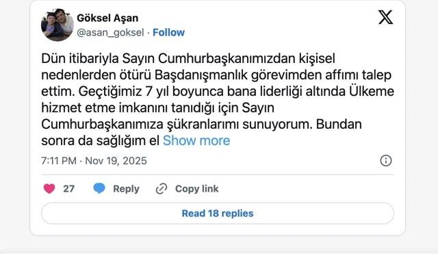 Göksel Aşan’ın istifası, Beştepe’de beklenmedik bir ayrılık olarak değerlendirilirken, yeni görevlendirmeye ilişkin henüz resmi bir açıklama yapılmadı.