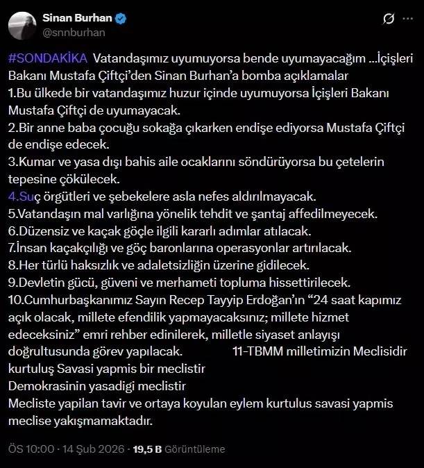 Gazeteci Sinan Burhan’a konuşan Bakan Çiftçi, vatandaşın huzurunun her şeyin önünde olduğunu vurguladı.