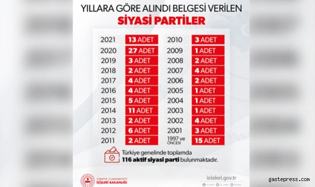 İçişleri Bakanlığı, siyasi parti kuruluşu için yapılan başvurular ve aktif siyasi parti sayısına ilişkin rakamları açıkladı. Bakanlığın Twitter hesabından yapılan açıklamada, "2020 yılında Bakanlığımız Genel Sekreterliği'ne, siyasi parti kuruluşu için başvuran 27 siyasi partiye, 2021 yılı içerisinde ise şu ana kadar 13 siyasi partiye 'alındı' belgesi verildi. Türkiye genelinde faaliyette bulunan aktif siyasi parti sayısı 116" ifadelerine yer verildi.