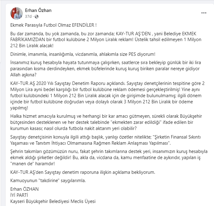Özhan yaptığı açıklamada, “Bu dar zamanda, bu yok zamanda, bu zor zamanda; KAY-TUR AŞ'DEN, yani Belediye EKMEK FABRİKAMIZDAN bir futbol kulübüne 2 Milyon Liralık reklam! Üstelik tahsil edilmeyen 1 Milyon 212 Bin Liralık alacak! Dinimle, imanımla, insanlığımla, vicdanımla, ahlakımla size PES diyorum! İnsanımız kuruş hesabıyla hayata tutunmaya çalışırken, saatlerce sıra bekleyip günlük bir iki lira parasından kısma derdindeyken, ekmek büfelerinde kuruş kuruş biriken paralar nereye gidiyor Allah aşkına?” ifadelerini kullandı.