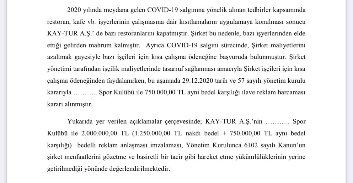 Erhan Özhan, “KAY-TUR AŞ 2020 Yılı Sayıştay Denetim Raporu açıklandı. Sayıştay denetçilerinin tespitine göre 2 Milyon Lira ayni bedel karşılığı bir futbol kulübüne reklam ödemesi gerçekleştirilmiş! Yine aynı futbol kulübündeki 1 Milyon 212 Bin Liralık alacak için de girişimde bulunulmamış; ilgili dönem içinde bir futbol kulübüne doğrudan veya dolaylı olarak 3 Milyon 212 Bin Liralık bir ödeme yapılmış! Halka hizmet amacıyla kurulmuş ve herhangi bir kar amacı gütmeyen, sürekli olarak Büyükşehir bütçesinden desteklenen ve her destek talebinde ‘ekmekten zarar edildiği’ ifade edilen bir kurumun kasası; nasıl olurda futbola nakit aktarım yeri olabilir? dedi.