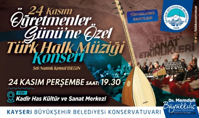 Büyükşehir Belediye Başkanı Dr. Memduh Büyükkılıç, medeniyetlerin beşiği olan Kayseri’de kültür ve sanata ayrı bir özel önem verirken, özel günleri de ihmal etmeyerek, birliğin, beraberliğin en güzel örneklerini sergiliyor. Başkan Büyükkılıç konu ile ilgili yaptığı açıklamada; kültür sanat eğitim ve spor faaliyetleri dalında ödüllü bir belediye olduklarını vurgulayarak, bu alanda çalışmaların sürdüğünü belirtti. Büyükkılıç, Büyükşehir Belediyesi Konservatuarı tarafından düzenlenecek Türk Halk Müziği Türkü Konseri’ne tüm Kayserilileri davet ederek; “Kayseri Büyükşehir Belediyesi Konservatuarı Türk Halk Müziği Koromuzun Namık Kemal Bilgin şefliğinde, 24 Kasım Öğretmenler günü özel konseri düzenlenecek. Konserimiz, 24 Kasım saat 19.30'da Kadir Has Kültür ve Sanat Merkezi’nde olacaktır. Tüm halkımız davetlidir” diye konuştu.