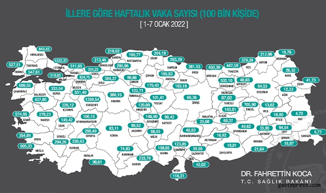 Sağlık Bakanı Fahrettin Koca ise paylaşımında vaka yoğunluğunun en çok artan illeri de açıkladı. Koca açıklamasında; “1-7 Ocak arasında vaka yoğunluğu bir önceki haftaya göre en çok artan 10 ilimiz: Bingöl, İstanbul, Eskişehir, Muğla, Gümüşhane, Kırklareli, İzmir, Yalova, Ankara, Karabük” ifadelerine yer verdi.