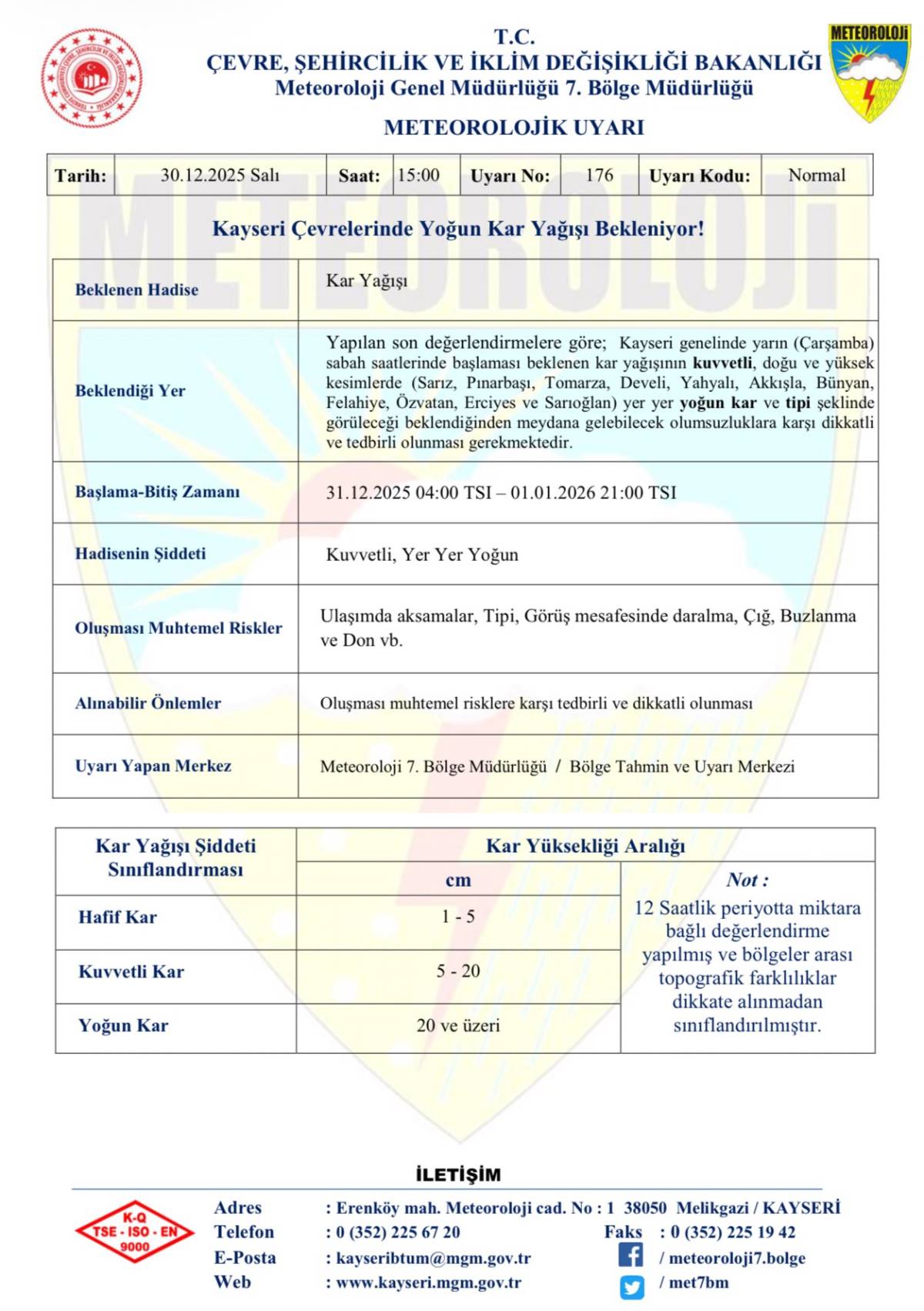 Meteoroloji’den yapılan açıklamada, yarın görülecek kar yağışının özellikle doğu ilçeler ile yüksek kesimlerde kuvvetli, yer yer yoğun ve tipi şeklinde olacağı tahmin ediliyor. Sarız, Pınarbaşı, Tomarza, Develi, Yahyalı, Akkışla, Bünyan, Felahiye, Özvatan, Erciyes ve Sarıoğlan çevrelerinde etkili olması beklenen yağışların, 1 Ocak 2026 Perşembe günü saat 21.00’e kadar süreceği öngörülüyor.
