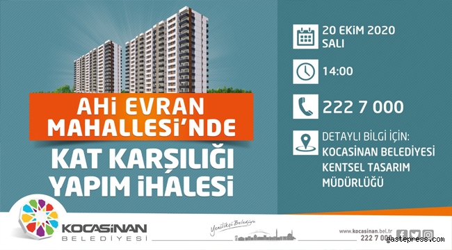 Öte yandan Ahi Evran Mahallesi’nde A blok 84 dairenin kat karşılığı ihalesinin 20 Ekim 2020 Salı günü saat 14.00'de gerçekleştirilecek olan ihale şartname ve eklerinin Kentsel Tasarım Müdürlüğü'nden temin edinilebileceği gibi 222 70 00 numaralı telefondan da ayrıntılı bilgi alınabileceği kaydedildi.