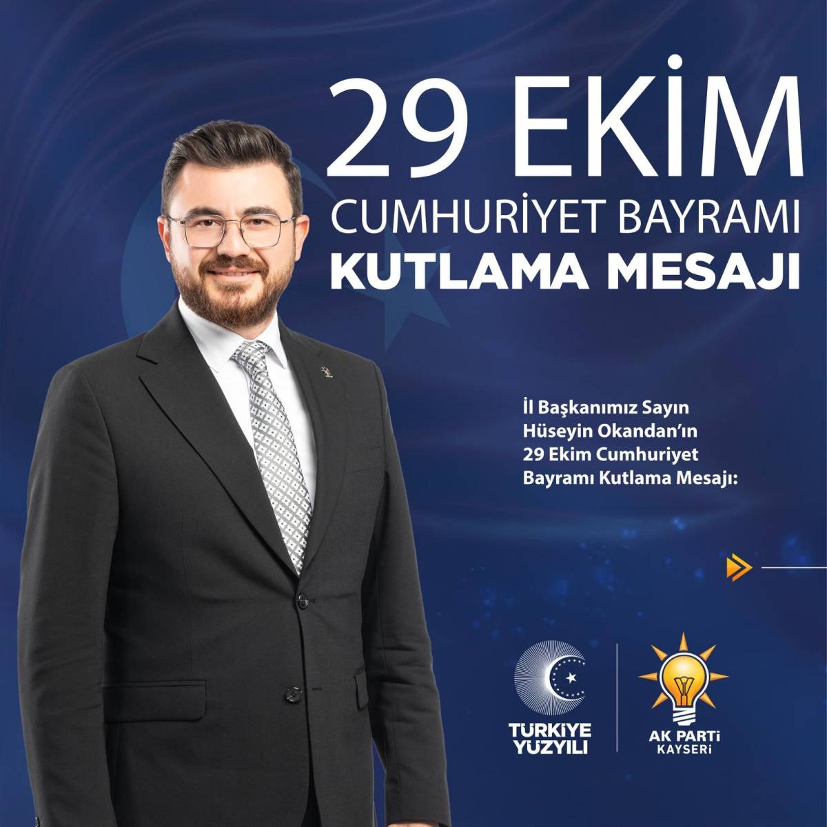 AK Parti Kayseri İl Başkanı Hüseyin Okandan, 29 Ekim Cumhuriyet Bayramı dolayısıyla bir kutlama mesajı yayımladı.