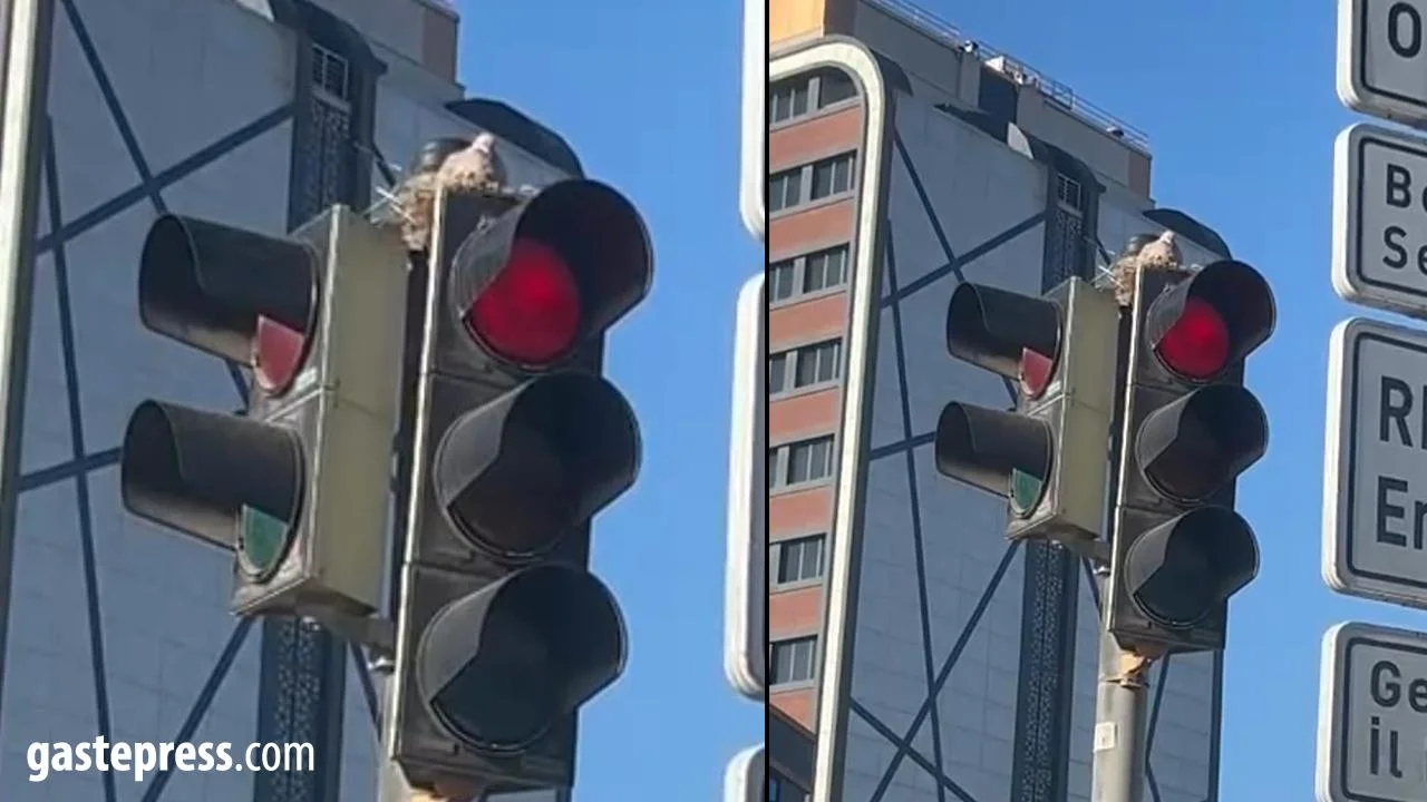 Trafik lambasının üzerinde kurulan yuva, kentte karşılaşılan sıra dışı anlardan biri olarak dikkat çekti.
