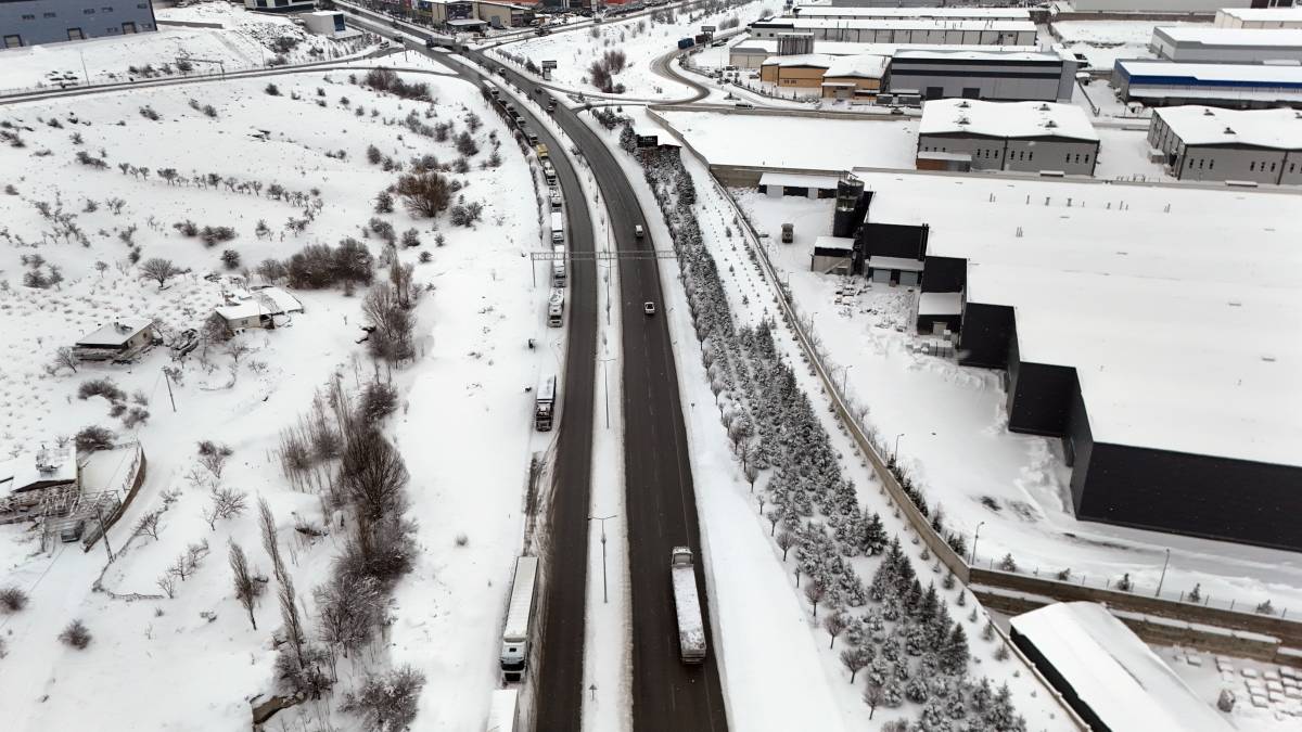 Bekleyen tırların oluşturduğu yoğunluk, dron ile havadan görüntülendi. Ortaya çıkan manzara, sınır kapılarında bekleyen tır kuyruklarını andırırken, kar yağışı ve olumsuz hava şartlarının bölgede ulaşımı ne denli etkilediğini gözler önüne serdi.