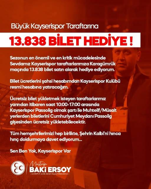 Milletvekili Ersoy açıklamasında, bilet ücretlerinin şahsi hesabından Kayserispor Kulübü’nün resmi hesabına yatırılacağını belirtti. Ücretsiz biletlerden yararlanmak isteyen taraftarların ise Passolig kartına sahip olmaları gerektiği ifade edildi. Taraftarlar, biletlerini Cumhuriyet Meydanı’nda bulunan Passolig gişesinden, belirtilen saatler arasında yükletebilecek.