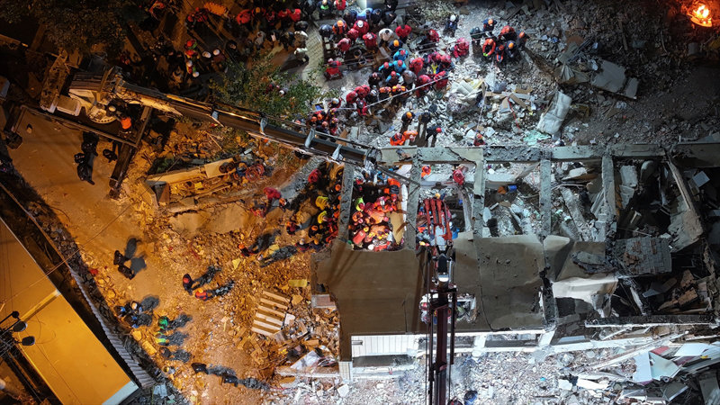 Yüzlerce kişiden oluşan arama kurtarma ekipleri, alandaki molozları kovalarla çıkarırken, beton bloklar vinç desteğiyle askıya alındı.