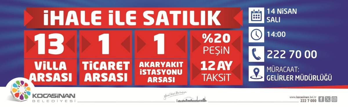 Belediye tarafından yapılan açıklamaya göre; 13 villa arsası, 1 ticaret arsası ve 1 akaryakıt istasyonu arsası, %20 peşin ve 12 ay taksit imkânıyla alıcılarını bekliyor. Söz konusu taşınmazlar, 14 Nisan Salı günü düzenlenecek ihale ile satışa sunulacak.
