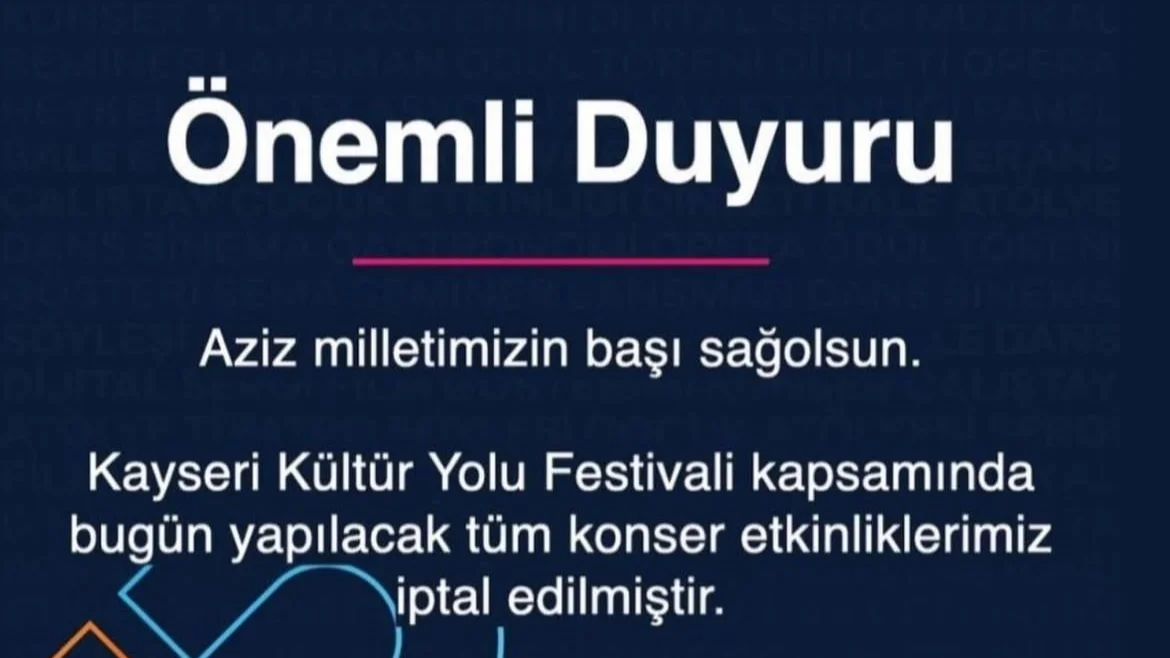 Yapılan açıklamada; "Aziz milletimizin başı sağ olsun. Kayseri Kültür Yolu Festivali kapsamında bugün yapılacak tüm konser etkinliklerimiz iptal edilmiştir. Şehitlerimize Allah'tan rahmet, yüce milletimize bağ sağlığı dileriz" denildi.