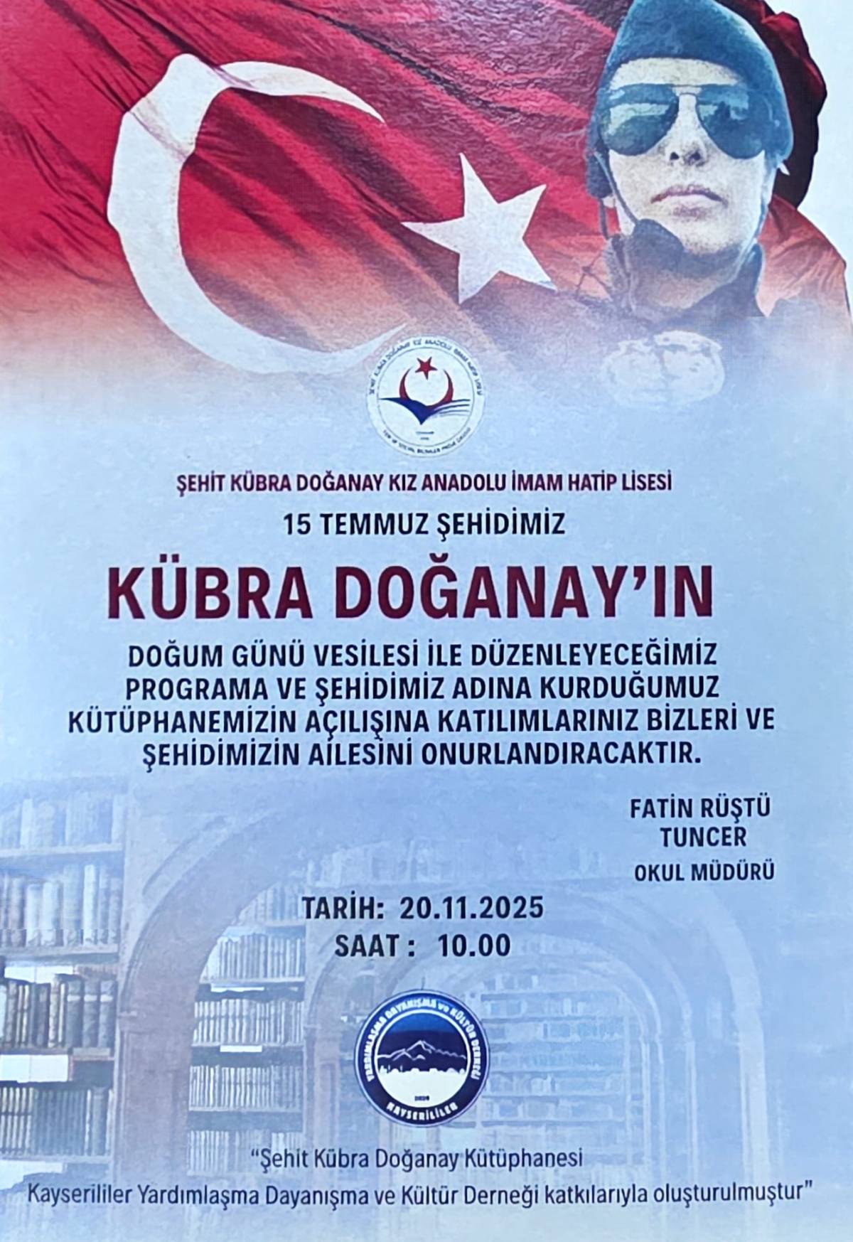 Dernek heyeti, Mersin’de yapılacak önemli bir açılış için Kayseri protokolüne resmi davetlerini de iletti. Mersin’de bir okula Şehit Kübra Doğanay’ın isminin verileceğini belirten dernek yöneticileri, açılışı yapılacak "Şehit Kübra Doğanay Kız Anadolu İmam Hatip Lisesi" için Kayseri’deki tüm protokolü törene davet ederek davetiyelerini takdim etti.