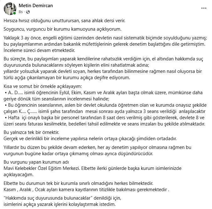 Yaklaşık üç ay önce engelli eğitimi üzerinden devletin nasıl sistematik biçimde soyulduğunu yazdığını hatırlatan Demircan, bu paylaşımlarının ardından bakanlık müfettişlerinin gelerek denetim başlattığını, inceleme sürecinin ise hâlen devam ettiğini dile getirdi.