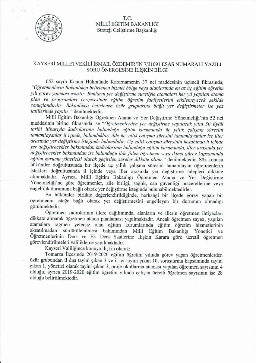 Bakanlık tarafından verilen cevapta ilave olarak şu bilgiler kaydedildi: “Kayseri Valiliğince konuya ilişkin olarak; Tomarza İlçesinde 2019-2020 eğitim öğretim yılında görev yapan öğretmenlerden özür grubundan il dışı tayini çıkan 3 ve il içi tayini çıkan 10, soruşturma kapsamında tayini çıkan 1, yönetici olarak tayini çıkan 3, proje okullarına ataması yapılan öğretmen sayısının 4 olduğu, ayrıca 2019-2020 eğitim öğretim yılında çalışan ücretli öğretmen sayısının ise 28 olduğu belirtilmektedir.”