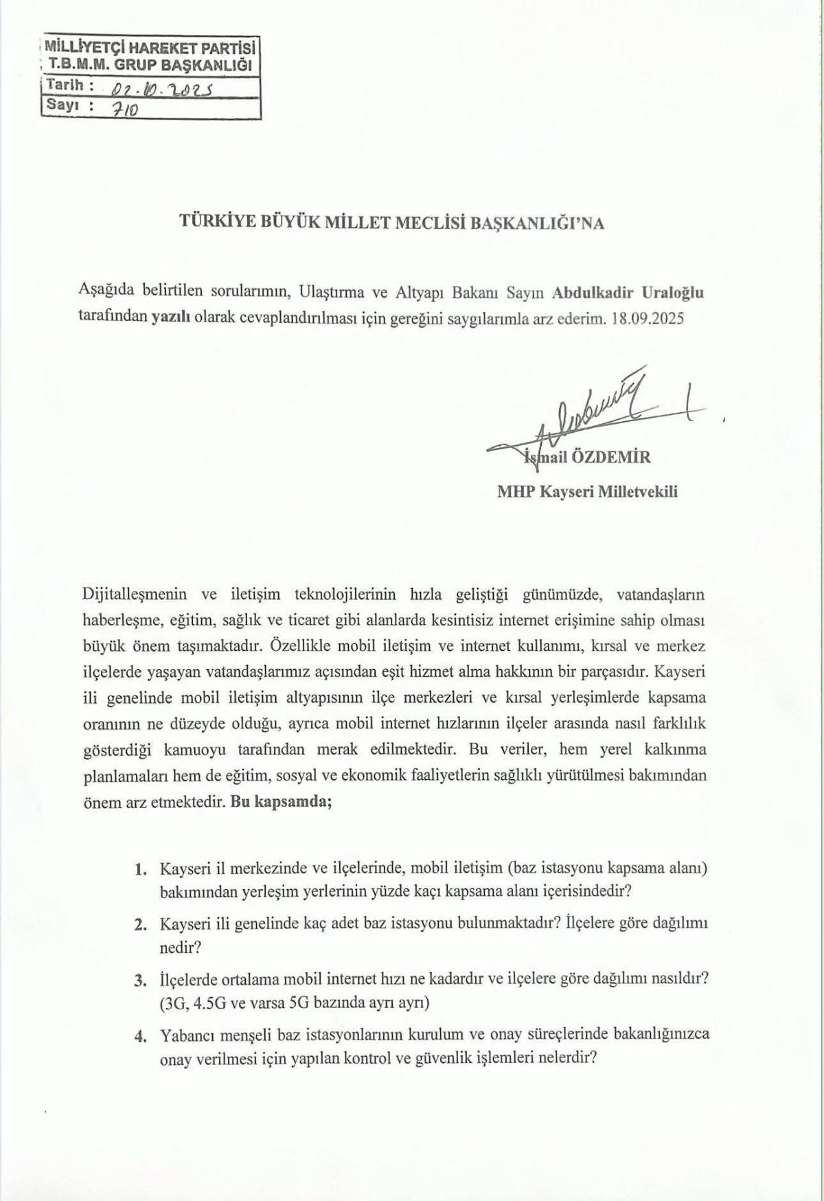 MHP Genel Başkan Yardımcısı ve Kayseri Milletvekili İsmail Özdemir, Bakanlığı’na Kayseri’de mobil iletişimde sorun yaşanan bölgelerin tespiti ve yaşanan sorunların aşılabilmesiyle ilgili soru önergesinde bulundu. Özdemir sunduğu önergede; "Dijitalleşmenin ve iletişim teknolojilerinin hızla geliştiği günümüzde, vatandaşların haberleşme, eğitim, sağlık ve ticaret gibi alanlarla kesintisiz internet erişimine sahip olması büyük önem taşımaktadır. Özellikle mobil iletişim ve internet kullanımı, kırsal ve merkez ilçelerde yaşayan vatandaşlarımız açısından eşit hizmet alma hakkının bir parçasıdır. Kayseri ili genelinde mobil iletişim altyapısının ilçe merkezleri ve kırsal yerleşimlerde kapsama oranının ne düzeyde olduğu, ayrıca mobil internet hızlarının ilçeler arasında nasıl farklılık gösterdiği kamuoyu tarafından merak edilmektedir. Bu veriler hem yerel kalkınma planları hem de eğitim, sosyal ve ekonomik faaliyetlerin sağlıklı yürütülmesi bakımından önem arz etmektedir" ifadelerini kullandı.