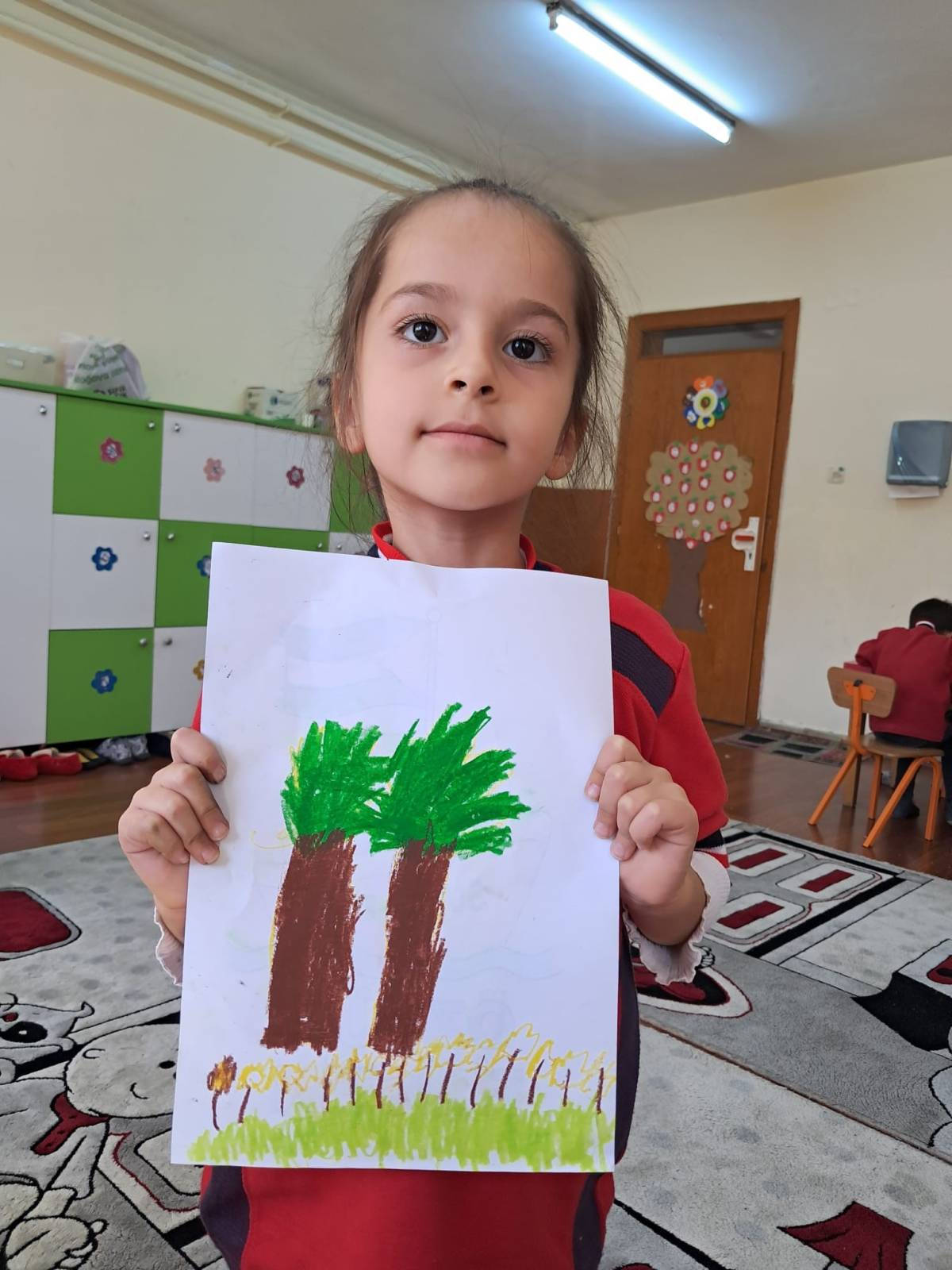 Ana Sınıfı Öğretmeni Hikmet Martin Ağaşe rehberliğinde düzenlenen etkinlikte öğrenciler, Filistin’e dair hissettikleri duyguları resimlerle ifade etti. Miniklerin çizdiği resimlerde en çok dikkat çeken temalar; ev, yatak, su ve ekmek oldu. Bu basit ama derin semboller, savaşın çocuk gözünden nasıl algılandığını çarpıcı bir şekilde ortaya koydu.