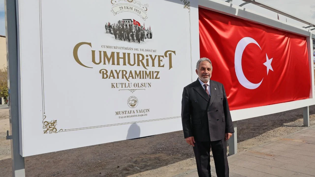 Talas Belediye Başkanı Mustafa Yalçın’ın özel olarak hazırlattığı tasarımda, üç boyutlu Türk bayrağı yer aldı. Bayrağın yanında ise "Cumhuriyet Bayramımız Kutlu Olsun" mesajı, estetik çizgiler ve Cumhuriyet’in ilanını simgeleyen görsellerle birlikte sergilendi.