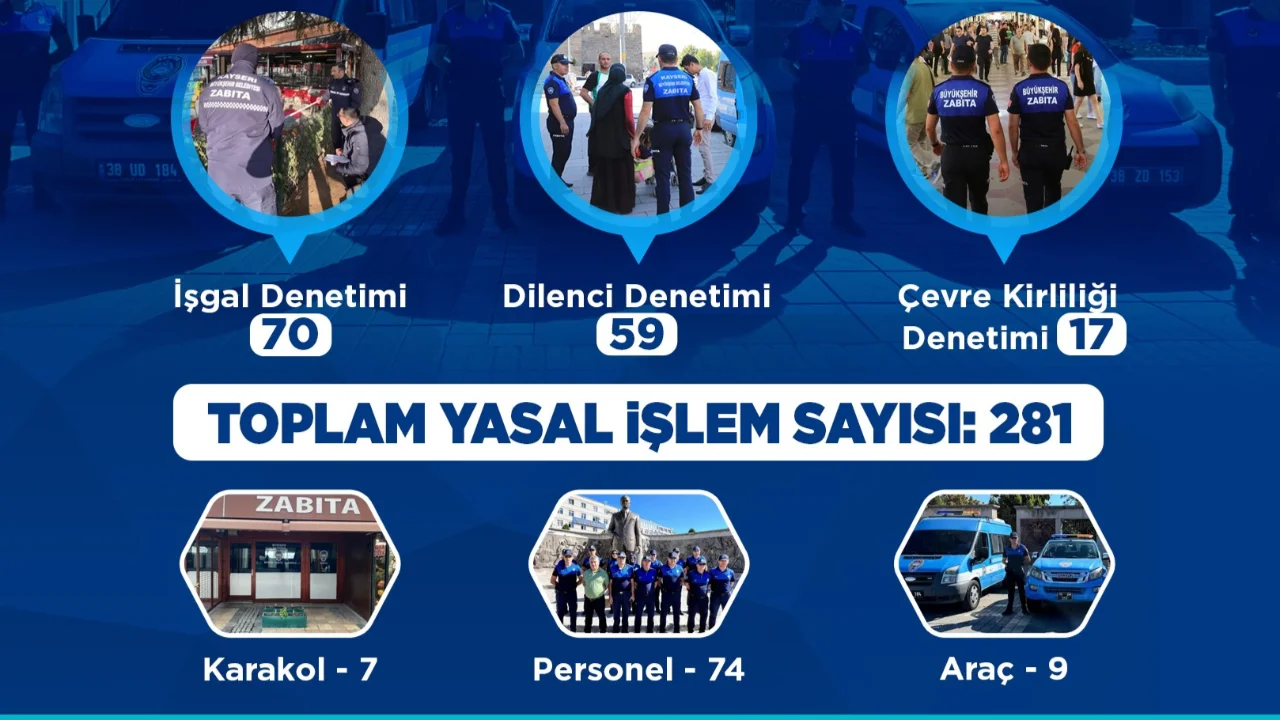 7 karakol, 9 araç ve toplam 74 personel ile denetim faaliyetlerini titizlikle yürüten Kayseri Büyükşehir Belediyesi Zabıta Daire Başkanlığı, şehrin huzur ve güvenliğine katkı sağlamayı sürdürüyor.